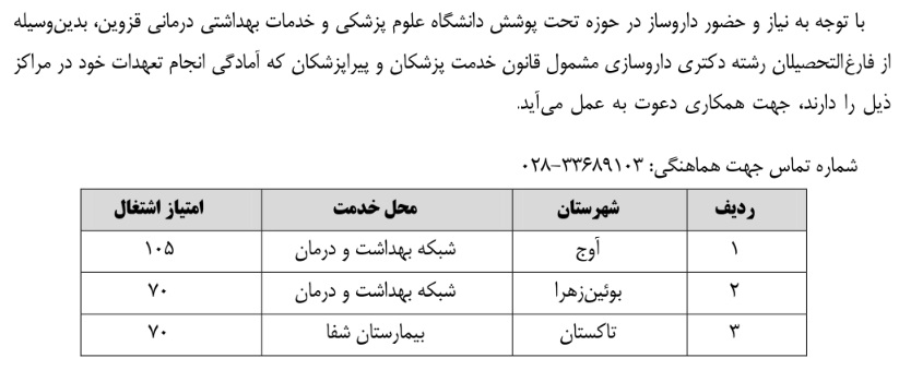 جذب نیروی داروساز مشمول قانون خدمت ۲۵ آذر ۱۴۰۴ | ۰۹:۰۰ کد : ۵۷۰۵۷ اطلاعیه ارسال به دیگران نام شما ایمیل شما ایمیل دریافتکننده ارسال انصراف تعداد بازدید:۶۳۰ جذب نیروی داروساز مشمول قانون خدمت در دانشگاه علوم پزشکی قزوین